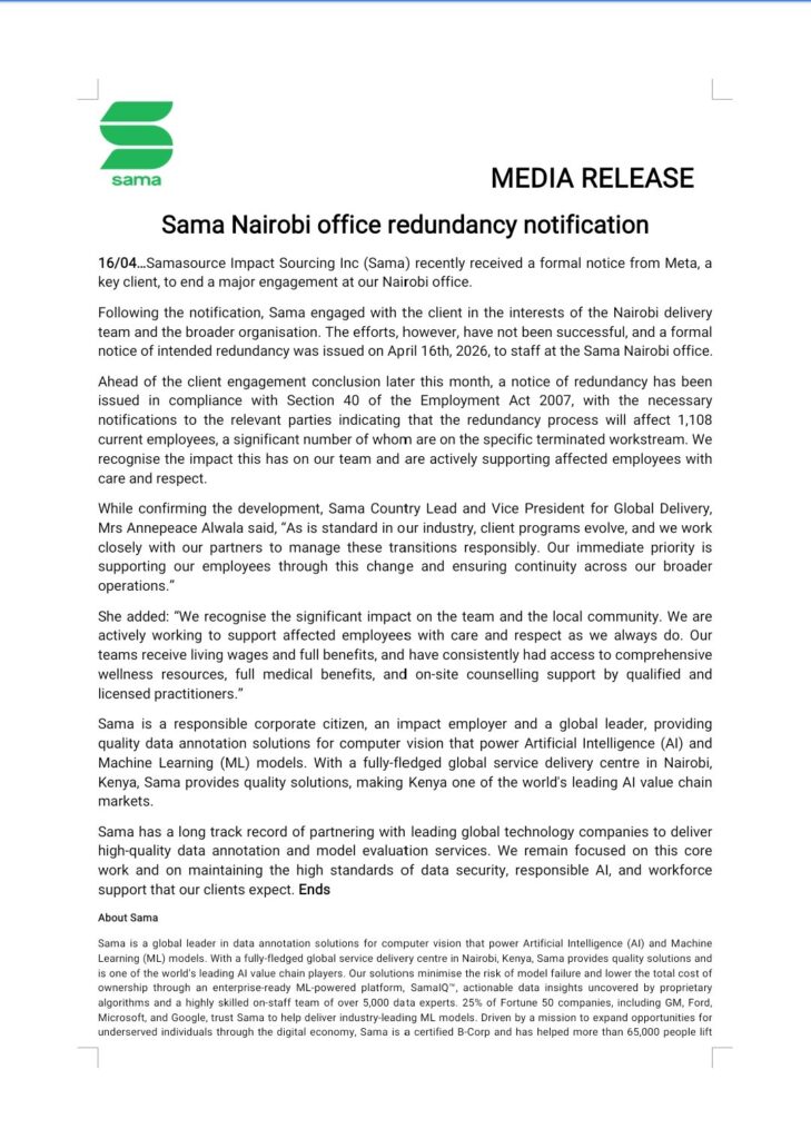 Meta drops Sama contract, leaving 1,108 Kenyans jobless
